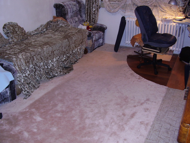 KJKJ, у нас есть тоже ковролин, длина ворса -- сантиметра полтора, цвет -- что-то вроде какао с молоком (розоватый беж), ну белый, конечно, но все-таки светлый, мы его, сорри, "нашли" (ну, в смысле, взяли возле секонд-хенд-бачка ), так вот муж его чистил Ванишем для ковров и щеткой, подпалины выстригал ножничками, ну, не могу сказать, что совсем уж как новый стал, но как будто бы он у нас лежит годик... можно попробовать самой ванишем на уголке почистить (я коврики, нарезанные из этого ковролина, вообще стирала в ванне с порошком обычным, так самое сложное -- это их мокрые вытаскивать и отжимать, а так вроде приобрели нормальный вид, даже клей сзади сохранился), если хочешь, могу поискать фотки "мастер-класса" мужниного, типа "до" и "после". А сейчас мы вообще "собрали" пол в зале из этих самых кусочков и одного большого куска, ну и ламината остатки муж приносил с работы, вот что получилось (еще не везде пристрелили к полу)