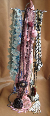 Я сначала хранила в небольшом чемоданчике, но многие украшения мнутся и запутываются, особенно бусы. Для таких проблемных вещей в настоящий момент стала использовать обычную подставку от поварешек