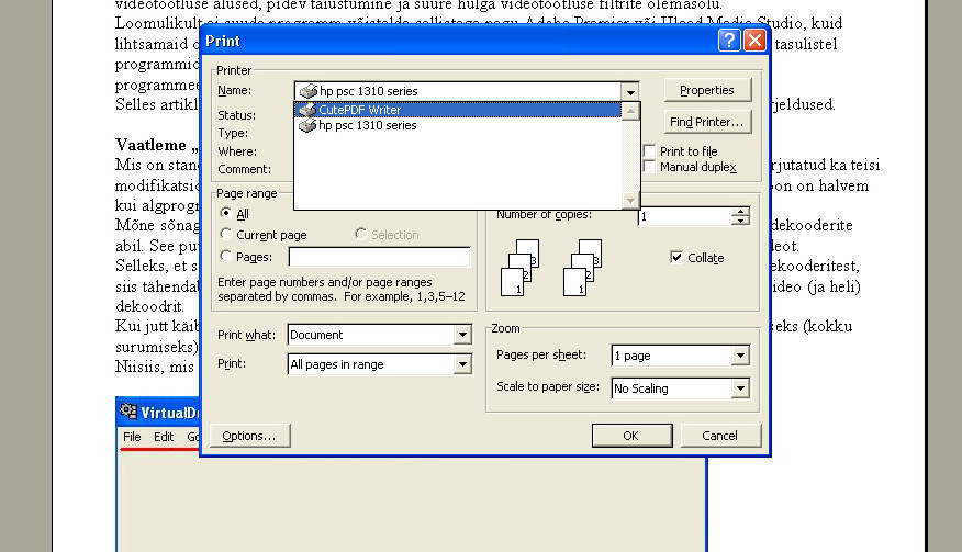 Как даю команду File - Print... (именно троеточнем), вскакивает окно как на картине. Выбираю виртуальный принтер и ОК и появляеться другое окно где сохраняю и всё. Через некоторое время в папке готовый пдф файл. Эксперимент Ворд 150 страниц, уйма картин и никаких проблем при создании пдф.