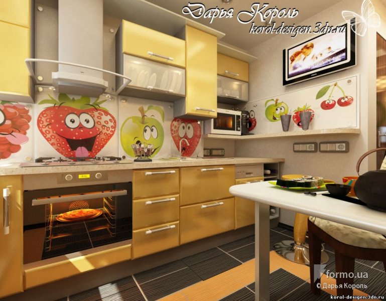 у меня тоже довольно яркая кухня... салатово-сиреневые фасады гарнитура, только недавно к ним в тон нашли кухонный стол со стульями и заказали пошив штор в таких же оттенках