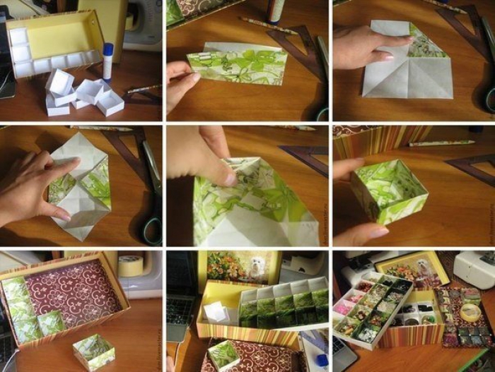 7. Если у вас пуговицы, иголки, другие мелкие предметы хранятся в баночках и прочих контейнерах и при этом стоят на горизонтальной поверхности, попробуйте сэкономить место и соорудить высокий ящик с ячейками для них.