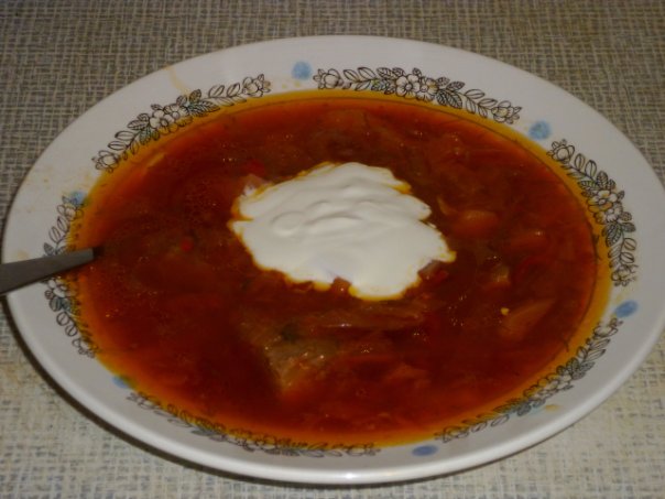 добавить зажарку,соль,лаврушку,перец чёрный,пару минут прокипит и готово,подавать со сметаной и зеленью,можно добавить уксус при варке или когда обжариваешь свёклу,но я добавляю в тарелку(у меня не всё любят с уксусом)(мясо конечно же вынуть,разрезать на кусочки).