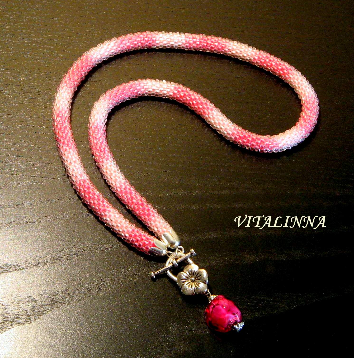 Этот шнур был связан специально, чтобы подвесить старую стеклянную бусину от бабушкиных бус. Бисер прозрачный чешский на нитке с переходом цвета в тон бусине.