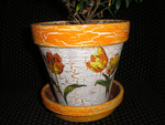 6. Если вы декорируете пластмассовый граненый горшок, можете использовать в работе ракушки и небольшую плитку. Сначала с помощью клея «Момент» на четырех гранях закрепить плитку. Затем на остальную поверхность горшка приклеить камешки. Далее принцип работы тот же, что и с керамическим горшком. Смесью из цемента, ПВА и воды заполнить пустоты, периодически промокая поверхность губкой. Когда цемент застынет, клеем «Момент» зафиксировать на плитках ракушки. Покрыть ракушки и камешки бесцветным лаком для ногтей.