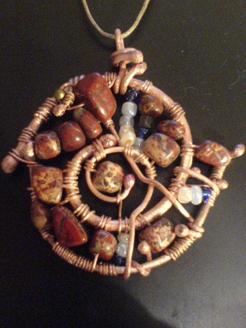 На первой работе стеклянные бусины. Есть горный хрусталь и натуральные камни, в общем, что перепадет из того и делается.Приятно, что понравилось, тем более, что занимаюсь медью несколько недель.Пока страшно нравится.В смысле - процесс...
