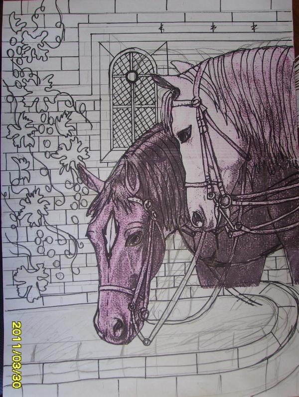 Итак, на основании карандашом намечаем контуры основных деталей:Лошади, колодей, окно.