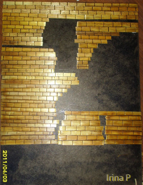 Сразу на полотно наклеиваем соломенные ленты, а затем выжигателем "рисуем" кирпичики. Примерно так, как на фотографиях