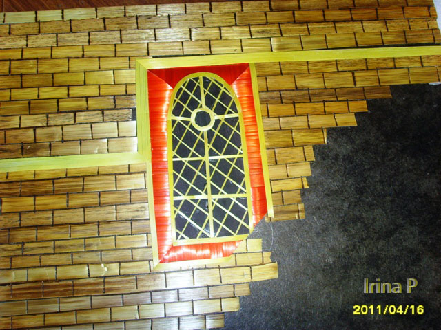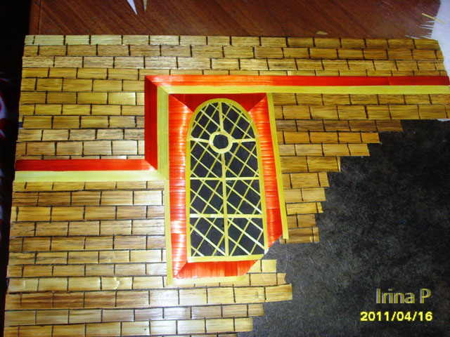 следом сразу на фоне делаем "карниз"-там, где осталлся черный фон (широкие полосы) у окна карниз идет зиг-загом, предполагаю два цвета: желтый и красный.Т.е. желтый будет выглядывать из-под красного, этим отделим наше окно от карниза и придадим большее выделение элементам стены.(итог покажу на фото).
