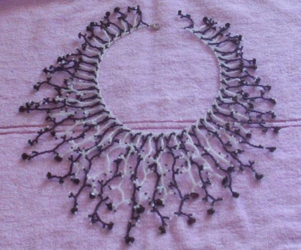 могу предложить одно колье в этой технике, так сказать руку набить. Очень простенькое. Схема правда на английском языке, но ничего я по картинкам разобралась. Главное количество подвесок расчитать и их длину, одних должно быть четное количество других нечетное. Если не разберетесь помогу.