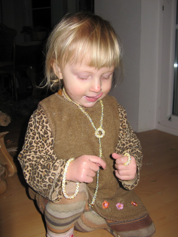 колечко, браслет и кольцо на шнурке - это 3-хпетельный вязаный шнур, а само колье плетено иголкой (кирпичик?), это я в первый раз попробовала. А шнур - во второй раз в жизни (ну, после 6-петельного, 4-х цветного и полутораметрового первого - это детские игрушки))))
