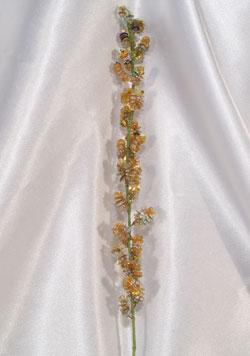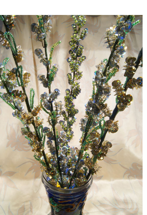 3. Техника выполнения - низание петлями. Для чего высыпьте бисер в емкость от мороженного или сырков, а пайетки выложите рядом на салфетку, и наберите на проволочку материал, чередуя 1 бисеринку (можно и 2 -3 бисеринки) и 1 пайетку. Этот набор называется НИЗКОЙ. Для веточки длиной в 30 -35 см надо низку длиной:(расчет= почки у вербочки через 1-1,2 см, петля длиной 2,5-3,0 см = получается низка длиной: 3 см. х на 30 см-30 почек = около 1 метра). А далее надо из этой низки скрутить петли через 1 - 1,2 см (Я кручу по часовой стрелке 4-6 движений рукой - получается 2-3 оборота); после чего приставить эту низку почек (не разрезая между собой) к веточке, начиная сверху и прикладывая почки левой рукой (пусть и с одной стороны, а затем распределите) - правой обматывать ниткой эти витки до конца вашего черешка. закрепить конец. Размешать чуть-чуть гуашь и клей ПВА цвета серой зелени (зеленый и чуть черный), пропитать кисточкой весь черешок и ГОТОВО. (Я иногда для пышности добавляю низку до ДЕСЯТКА ПЕТЕЛЬ из зеленого бисера - якобы первенькие листочки, также их НЕ разрезая - приставляю паралельно к почкам).