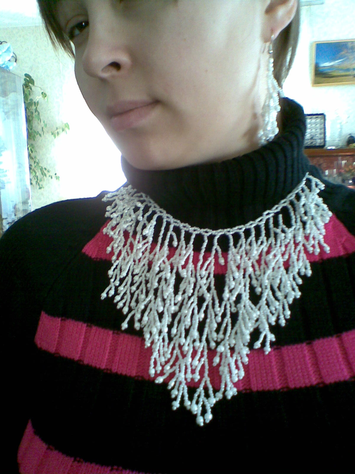 могу предложить одно колье в этой технике, так сказать руку набить. Очень простенькое. Схема правда на английском языке, но ничего я по картинкам разобралась. Главное количество подвесок расчитать и их длину, одних должно быть четное количество других нечетное. Если не разберетесь помогу.