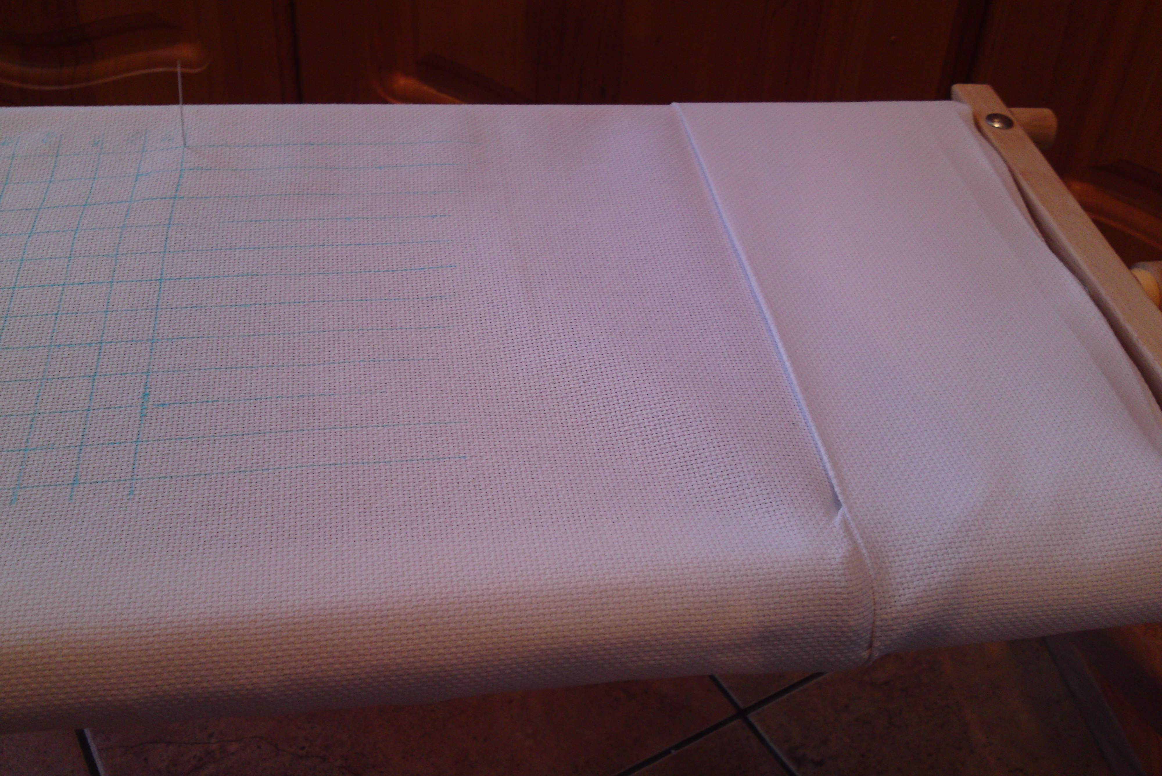 из за большого размера работы канву пришлось подгибать, рамка у меня 53 см в ширину, но этого все равно оказалось недостаточно, большой совет начинающим больших работ, когда загибаете канву на противоположную сторону при накручивании добавте ткань тогда натяжение получится равномерным и не будет провисаний. Мне потребовался целый день, чтобы найти подобные комментарии и натянуть канву