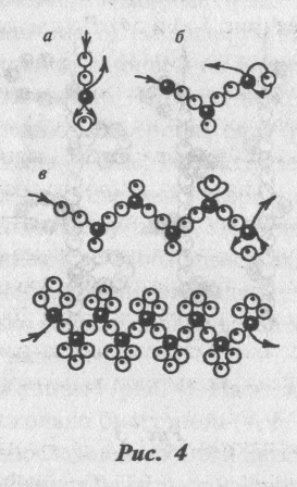 Кривулька (зигзаг) (рис. 4). На иголку с ниткой набирают несколько бисеринок (4, 5, 6), пропускают ее в предпоследнюю из них и натягивают (рис. 4 а). Затем набирают на иголку на одну бисеринку меньше (3, 4, 5) и повторяют операцию (рис. 4 б). Если оставить на конце не 1, а 3 бисеринки, то получится фигурная петелька (рис. 4 в).