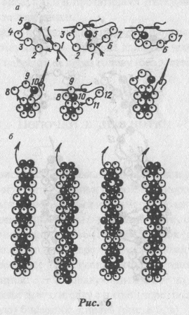 Колечки (рис. 8). Для 1-го ряда на нитку с иголками на концах набирают 6 (1—6) бисеринок (рис. 8 а), пропускают иголку II через 1-ю и натягивают нитку.