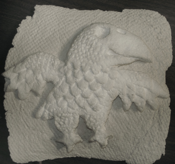 На полу в ванной разложите большой кусок полиэтилена, на него - стопку старых газет, а сверху хлопчатобумажную тряпку. А на тряпку положите комок бумажной массы.