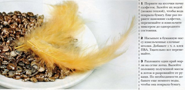 В готовую массу можно добавить маленькие кусочки цветной бумаги, фольги, шерстяных ниток, сухие растения и пр. Затем перелейте над раковиной в дуршлаг и дайте воде стечь. Выложите массу в миску и добавьте немного клея ПВА.