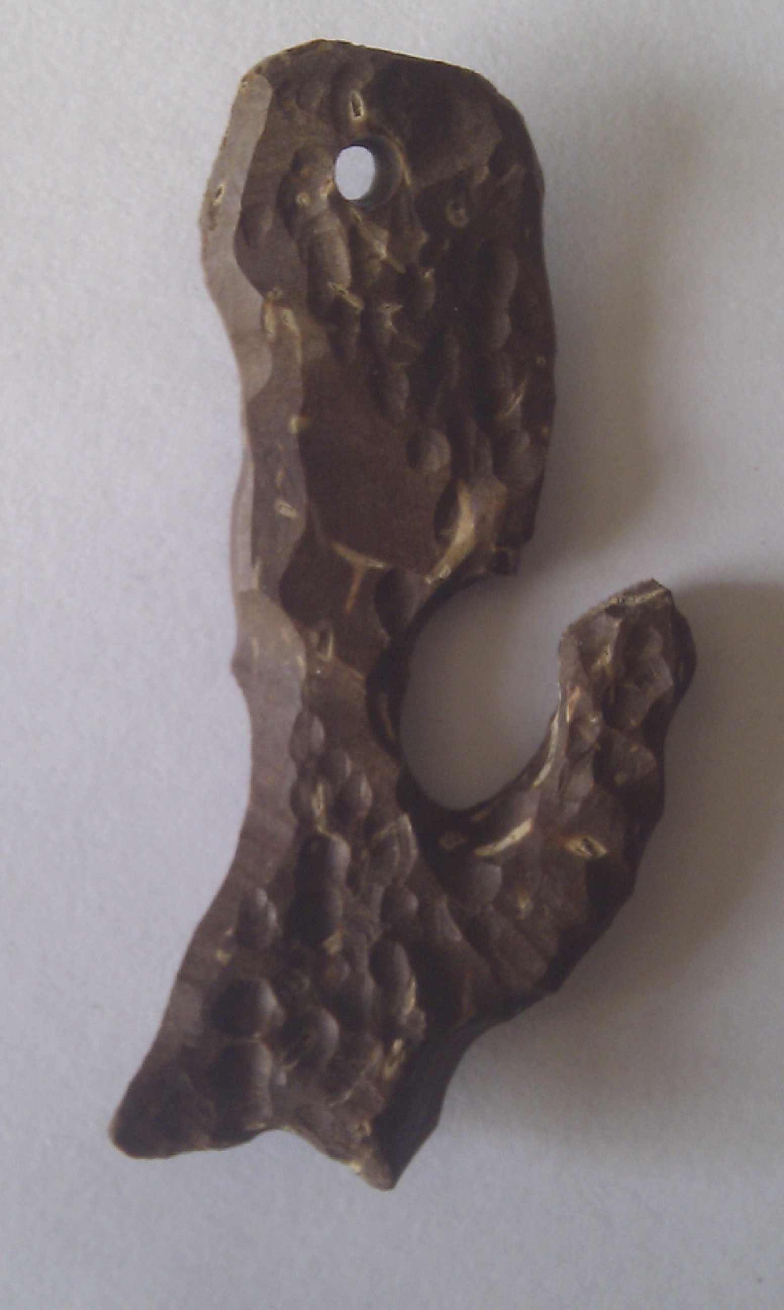 Первым получился крюк, правда непохожий на те что опубликованы выше. Вторым вот такая брошь-подвеска. Материал интересный, твердый и при нагреве интересный сладковатый запах выдает. Сильно не ругайте. Это моя первая попытка в обработке дерева и паяния с меди....