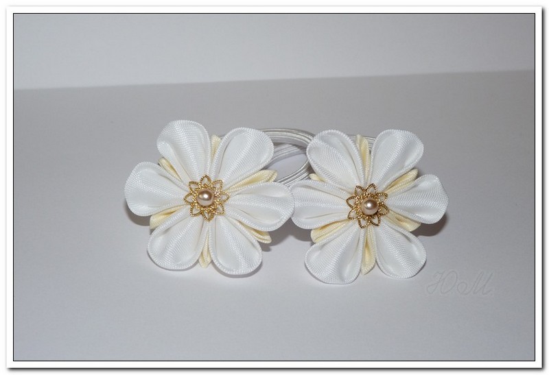 Специально же для конкурса я сделала небольшой мастер-класс, показав как делать двухслойные и однослойные лепестки. Они присоединяются друг к дружке, с помощью иголки и нити, в определенной последовательности, чтобы получилась приятная глазу цветовая гамма. Затем украшаем в середине перламутровой бусиной. Пришиваем к резинке.