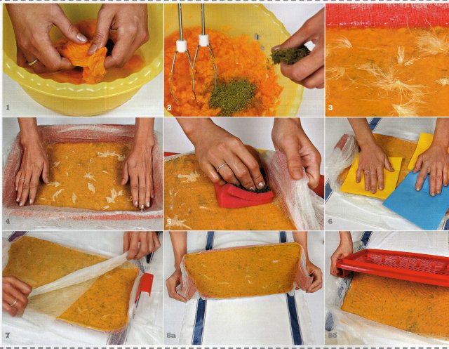 В готовую массу можно добавить маленькие кусочки цветной бумаги, фольги, шерстяных ниток, сухие растения и пр. Затем перелейте над раковиной в дуршлаг и дайте воде стечь. Выложите массу в миску и добавьте немного клея ПВА.