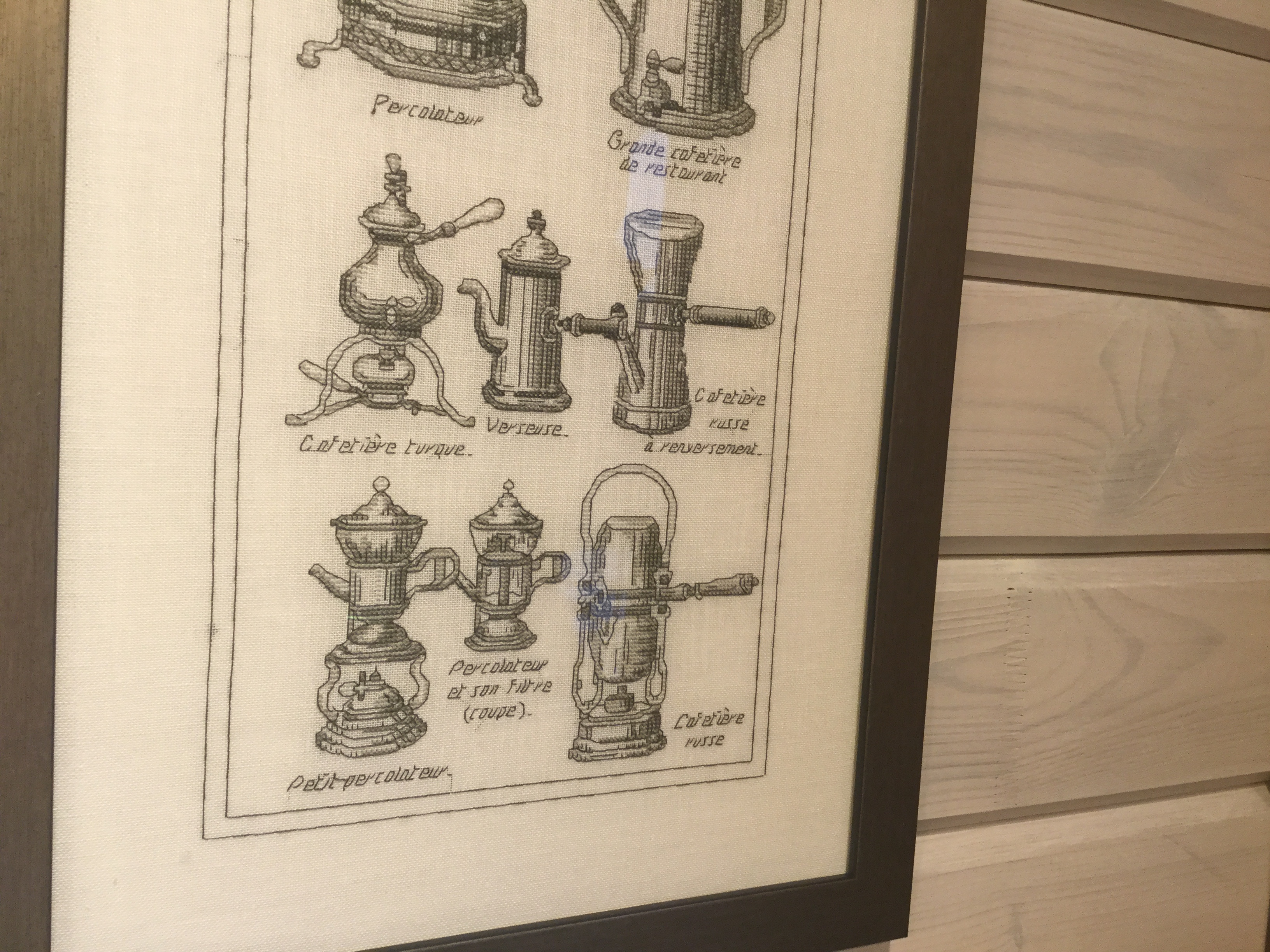 Thea Gouverneur - Кофе ( разные виды старинных кофеварок и все такое) на льне. Размер больше метра, поэтому не вмещается нормально, показываю по частям)) отлично вписался на кухню. Вы бы видели глаза мастера в багетке когда я развернула перед ним эту простыню)))
