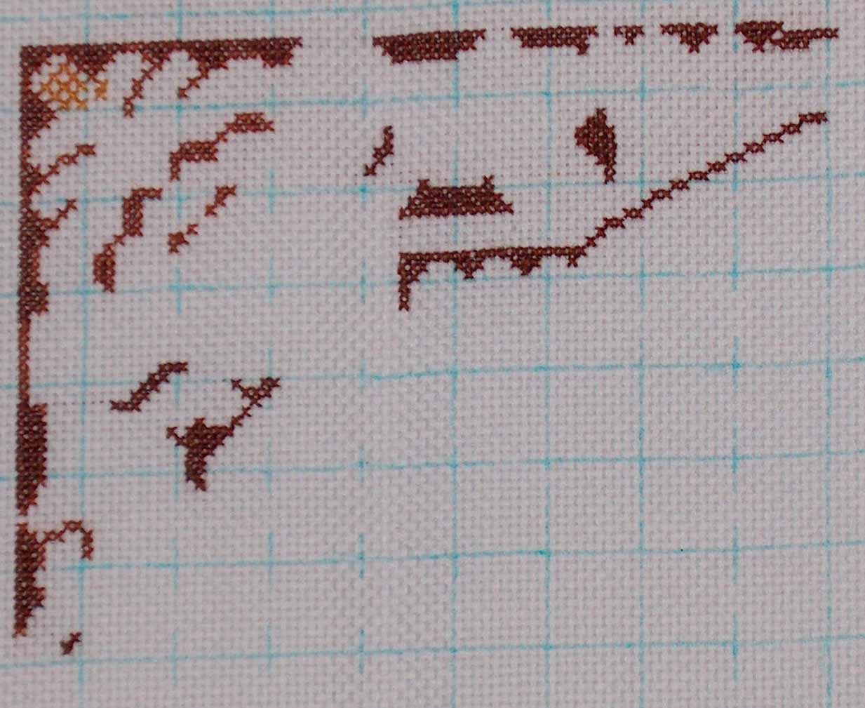 И я немножко продвинулась, только вот напасть какая: купила я себе пяльца новые большого диаметра, на которых сейчас вышиваю. Так радовалась, что могу сразу большие участки вышивать, а дошла до угла, и в угол пяльца не помещаются, так что придется сегодня после работы бежать покупать маленькие, чтоб в угол влезли.