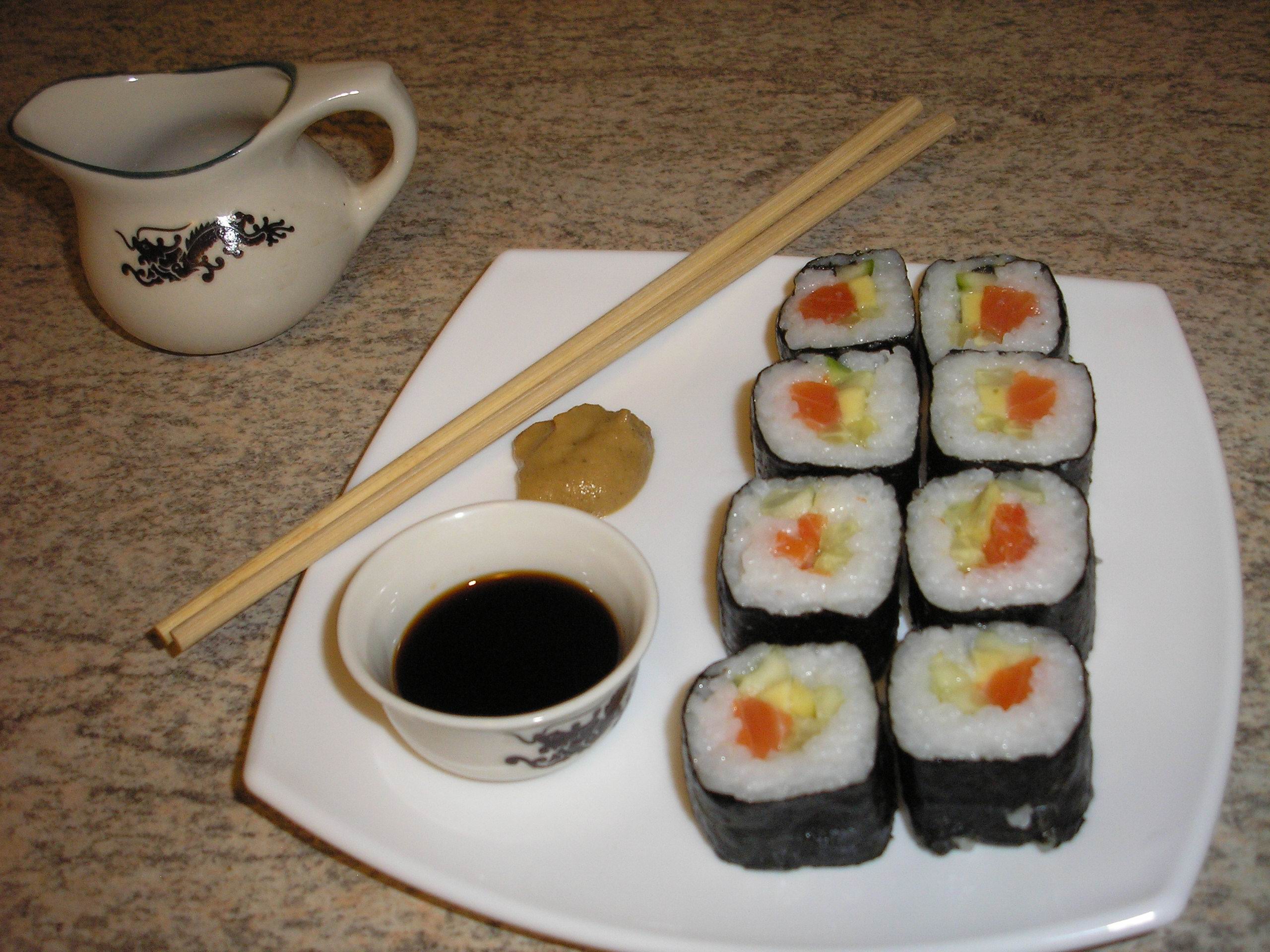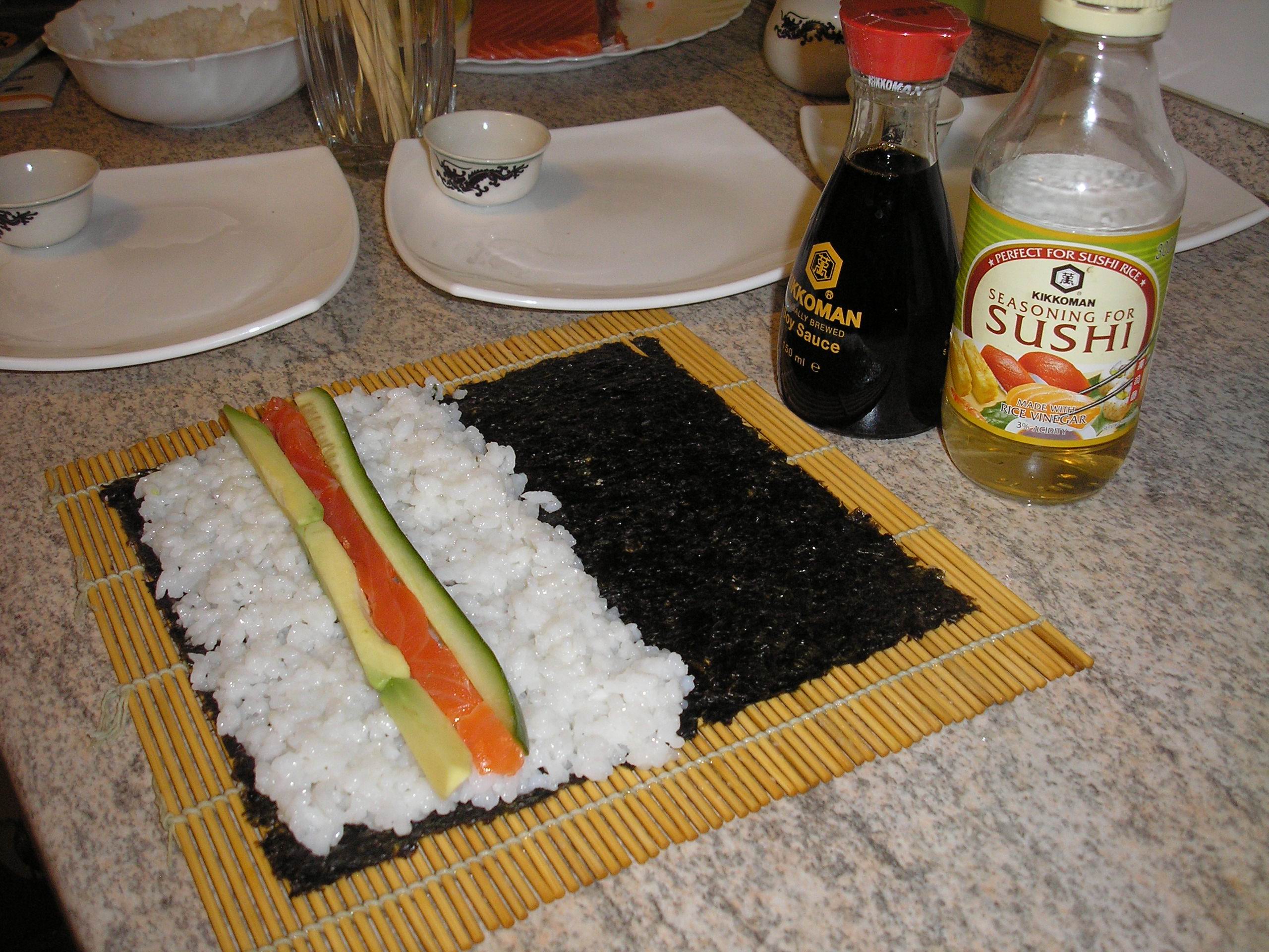 Были листы водорослей. и соус киккоман. И бамбуковый коврик, для работы и палочки. естесстна.