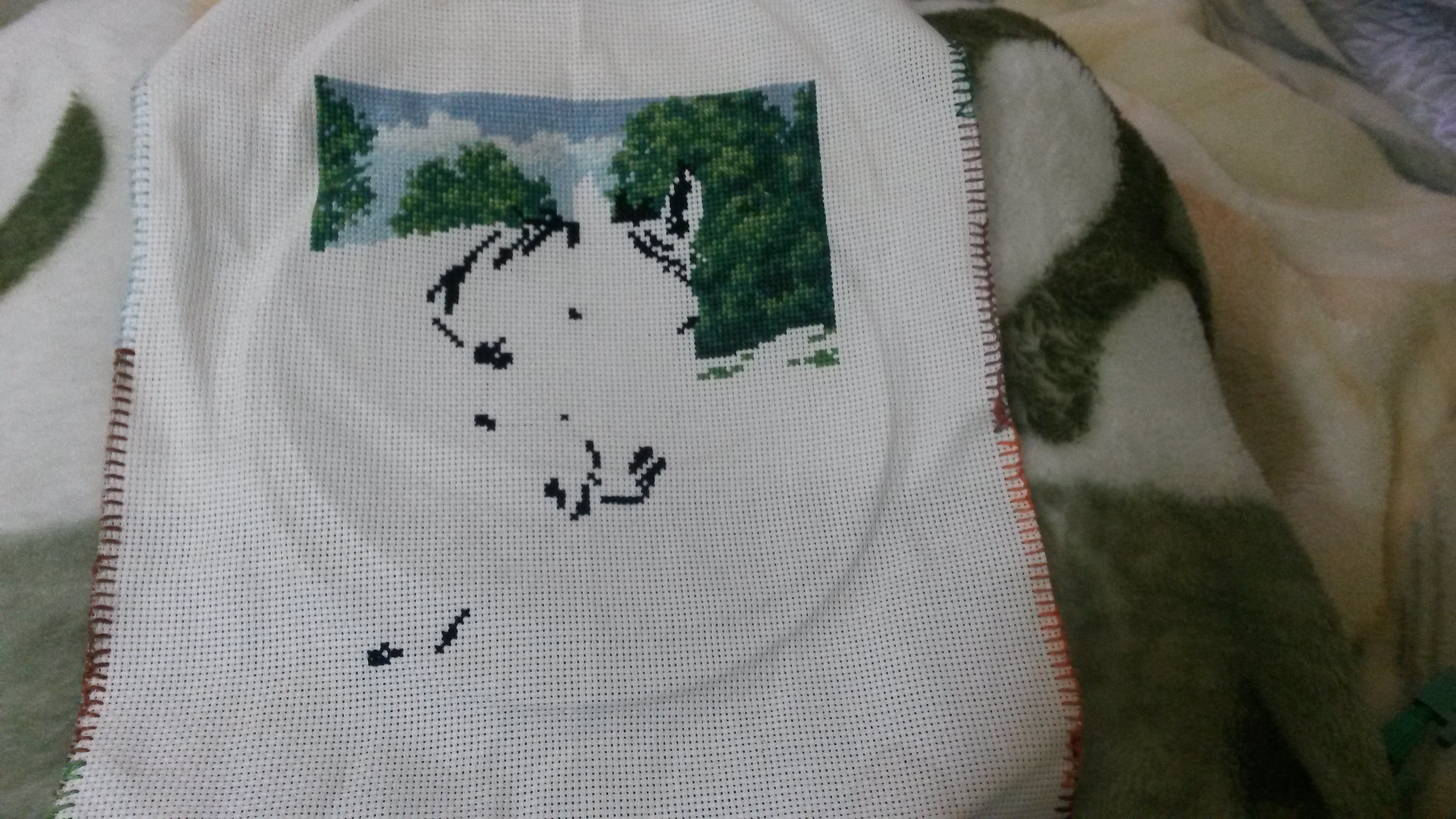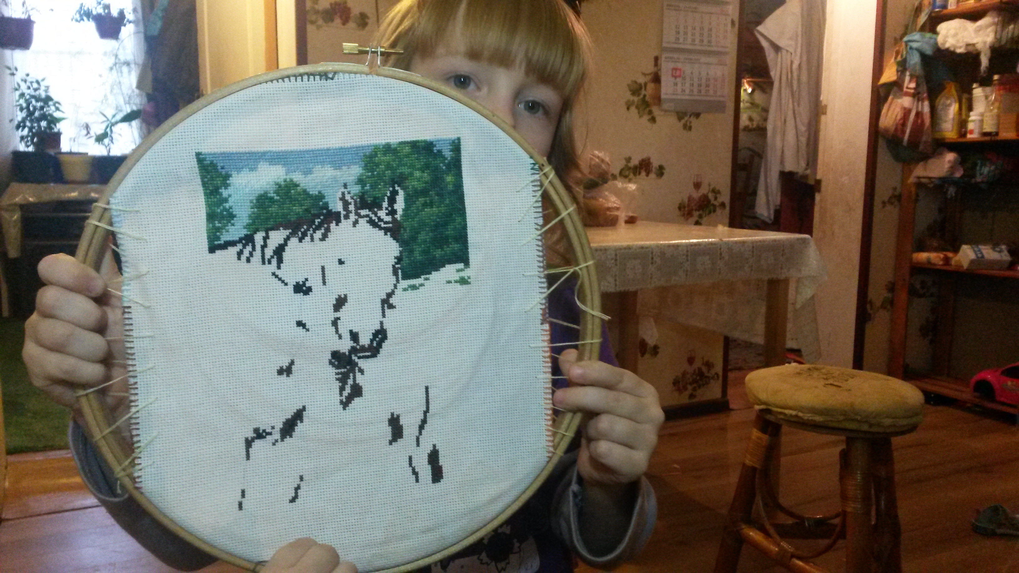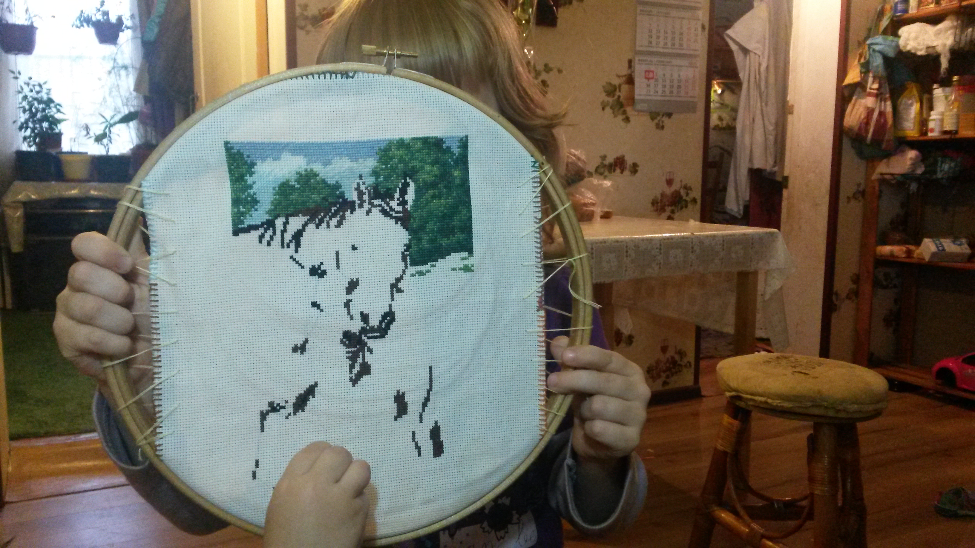 пытаюсь пристроить на другие пяльцы, но пластик уже слабый стал, а дерево этого размера не дает нужной мне натяжки. Придется все-таки идти в магазин за пяльцами другого размера.